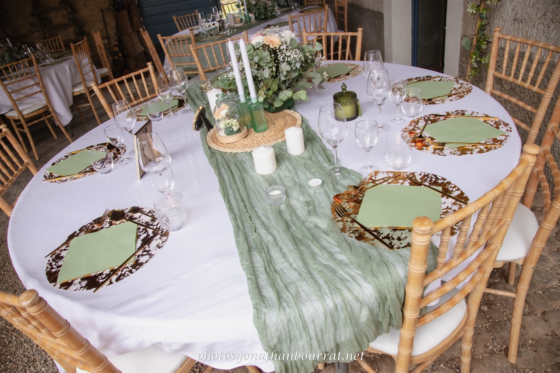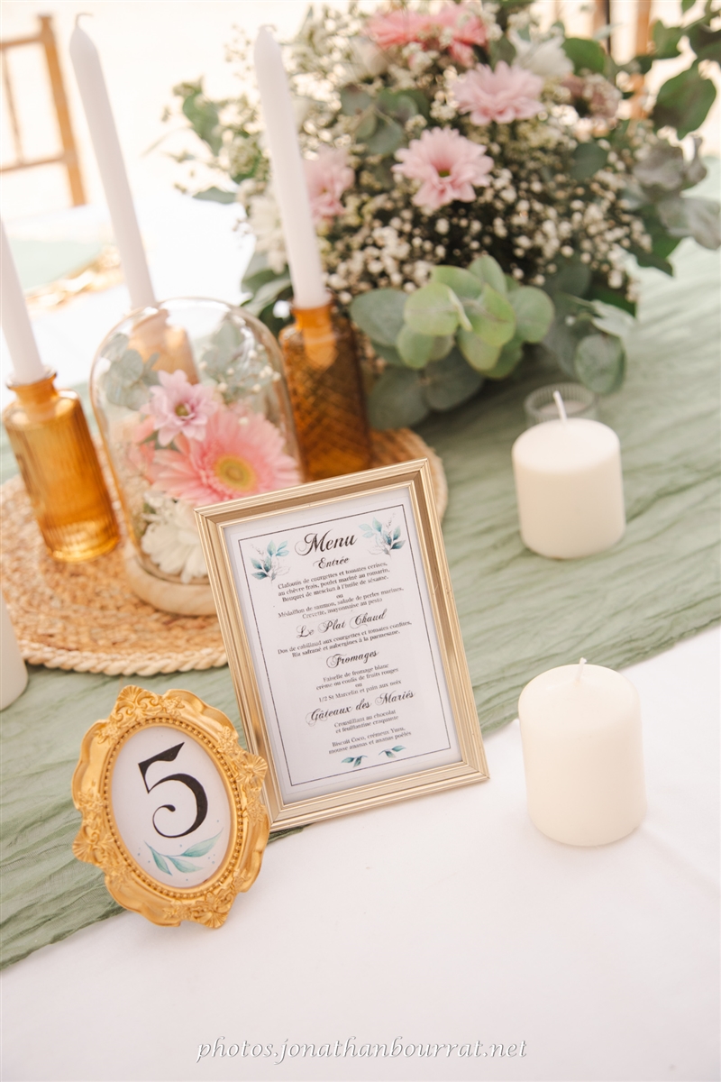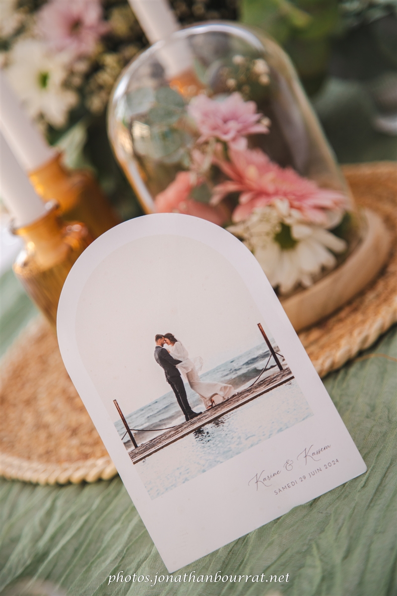 – le cadre de la réception avec la belle décoration florale, le joli faire-part, les tables élégamment préparées pour le diner…