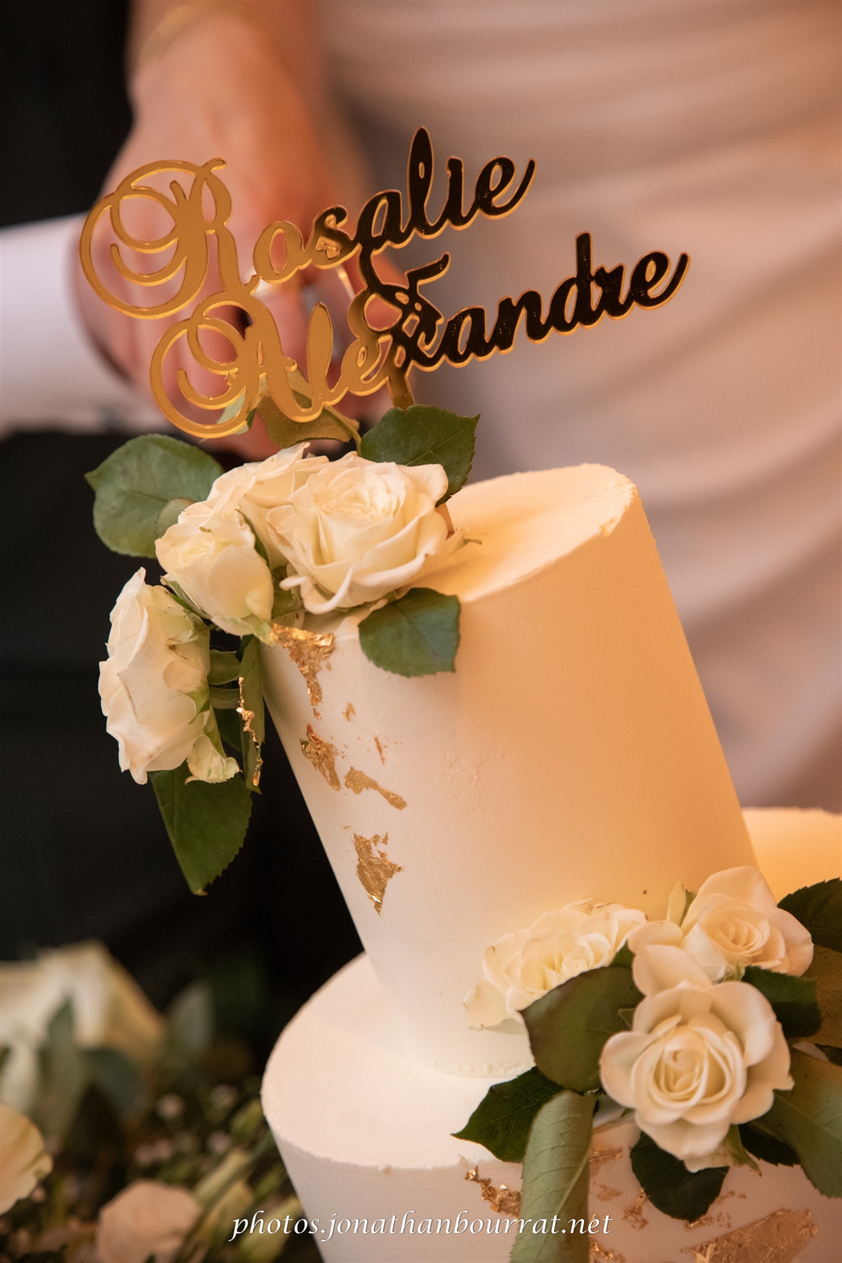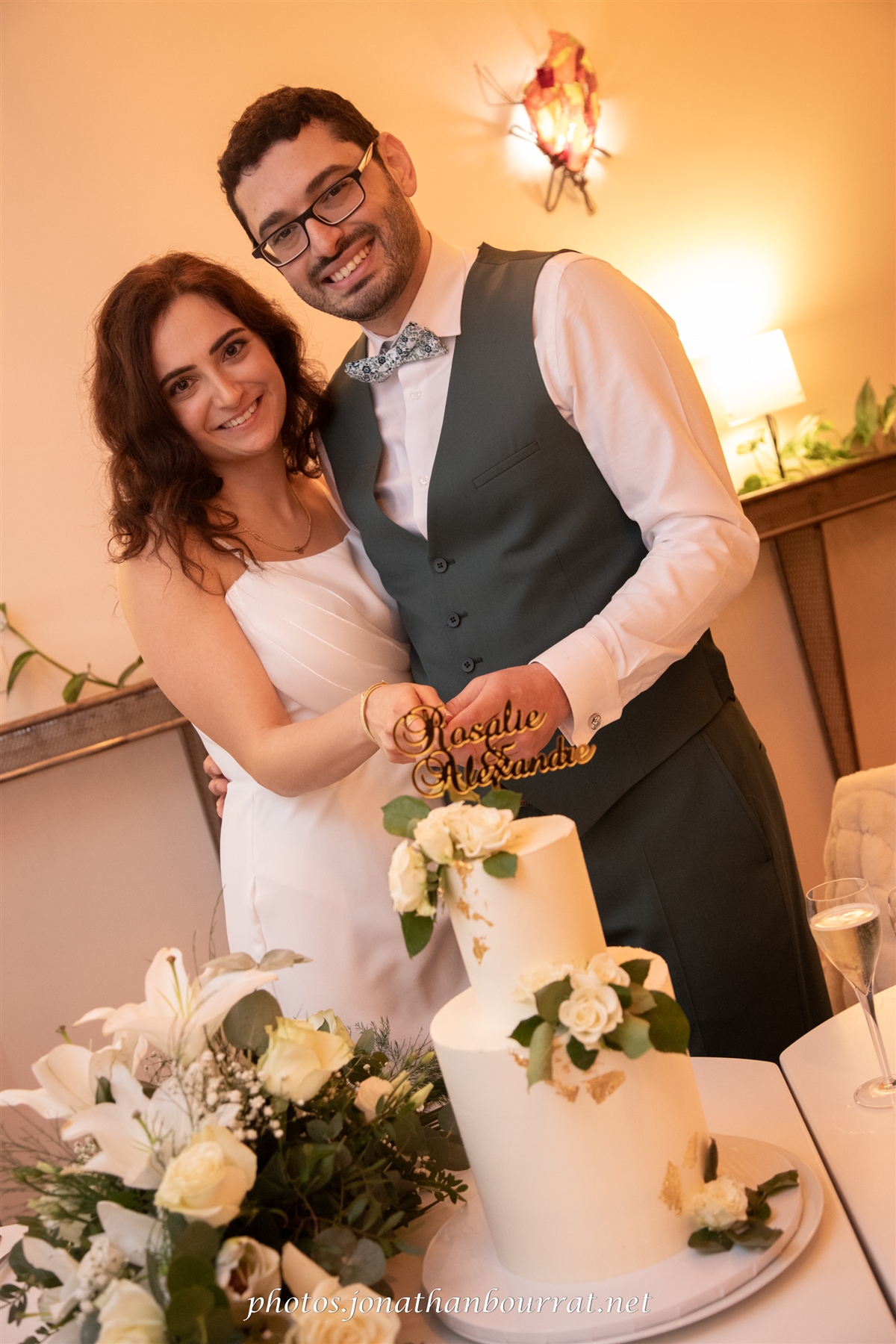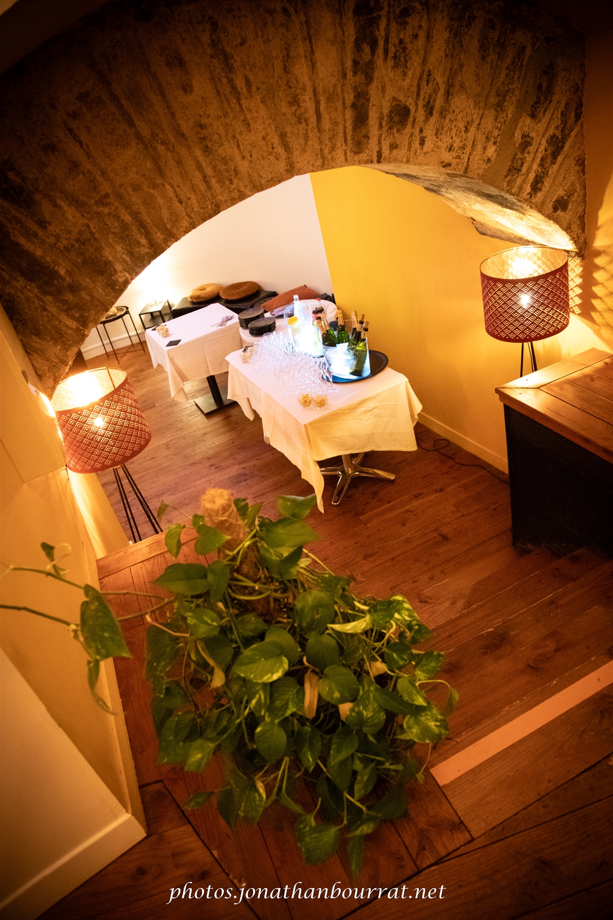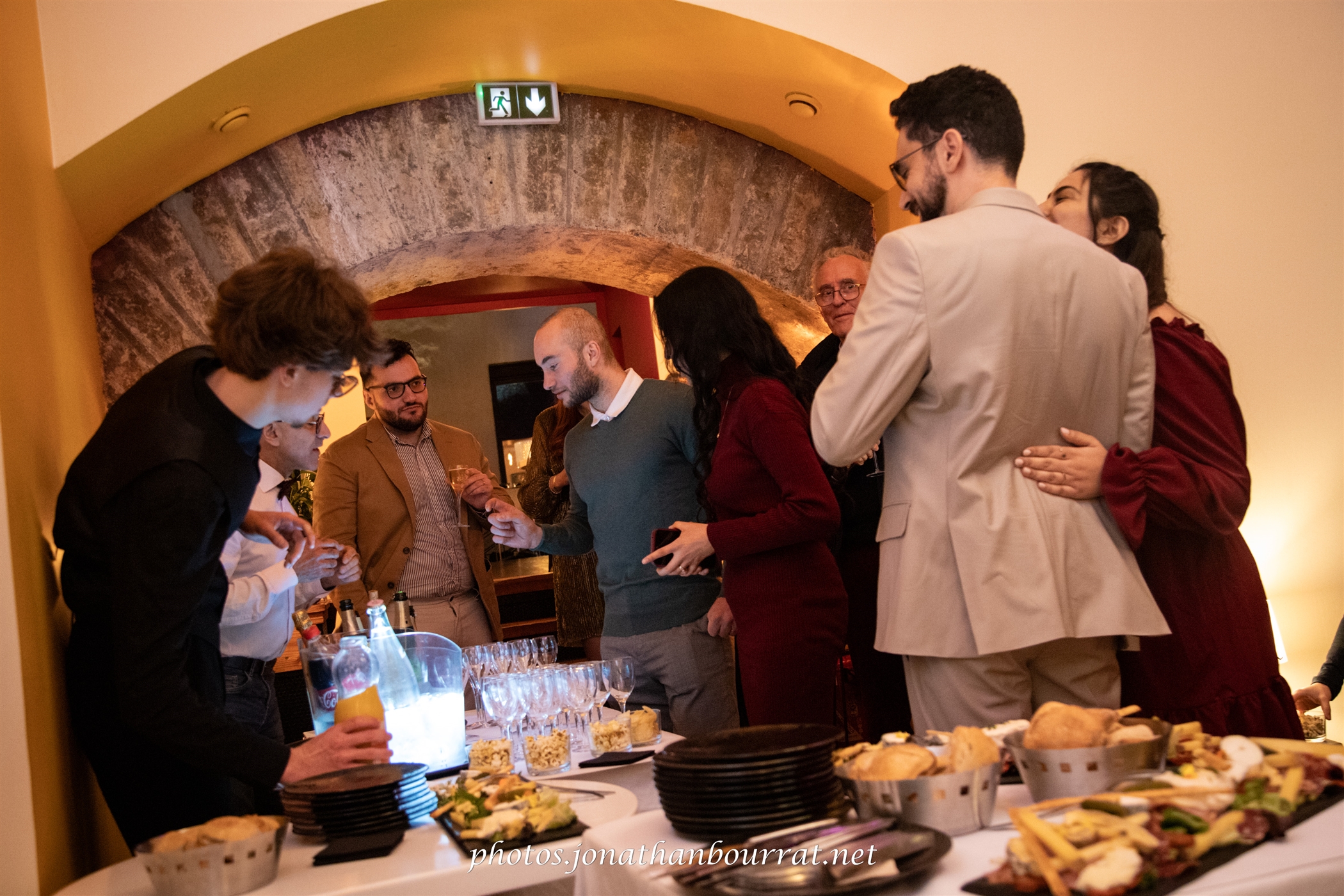 Enfin cette journée de noce se prolongea avec la soirée donnée cette fois du côté du restaurant les Voûtes (à Caluire-et-Cuire). Un charmant établissement situé le long des berges de la Saône, juste en face de l’île Barbe. C’est là que se déroula le cocktail/apéritif, ce fut également l’occasion de faire quelques clichés de nouveaux mariés avec leur joli gâteau blanc.