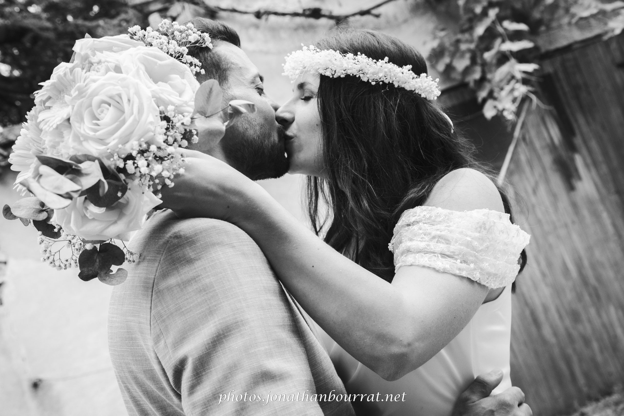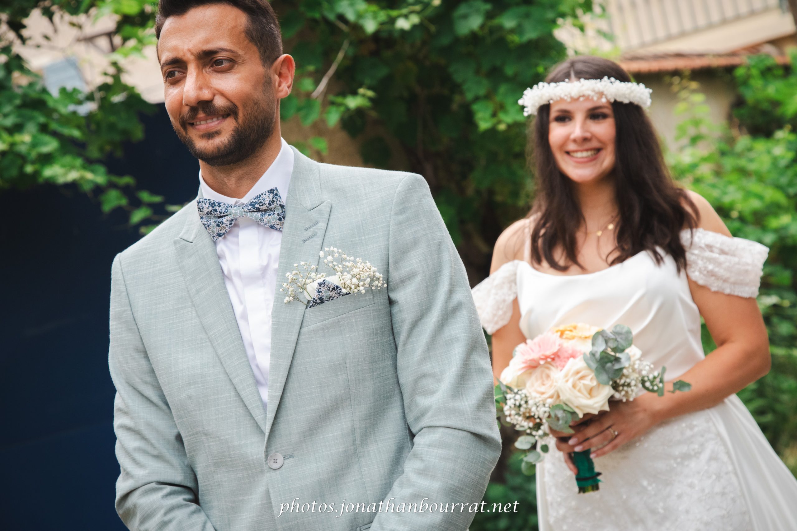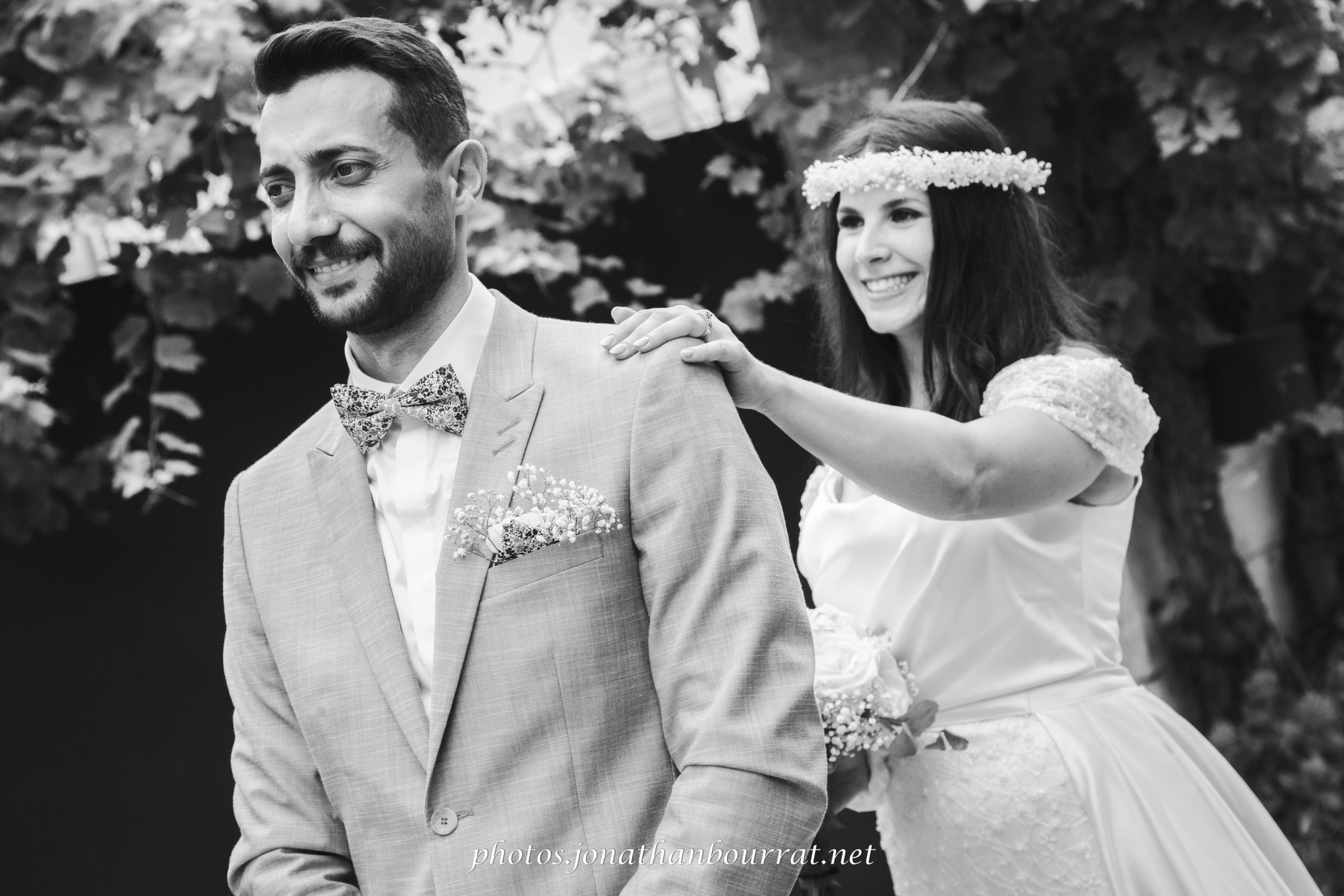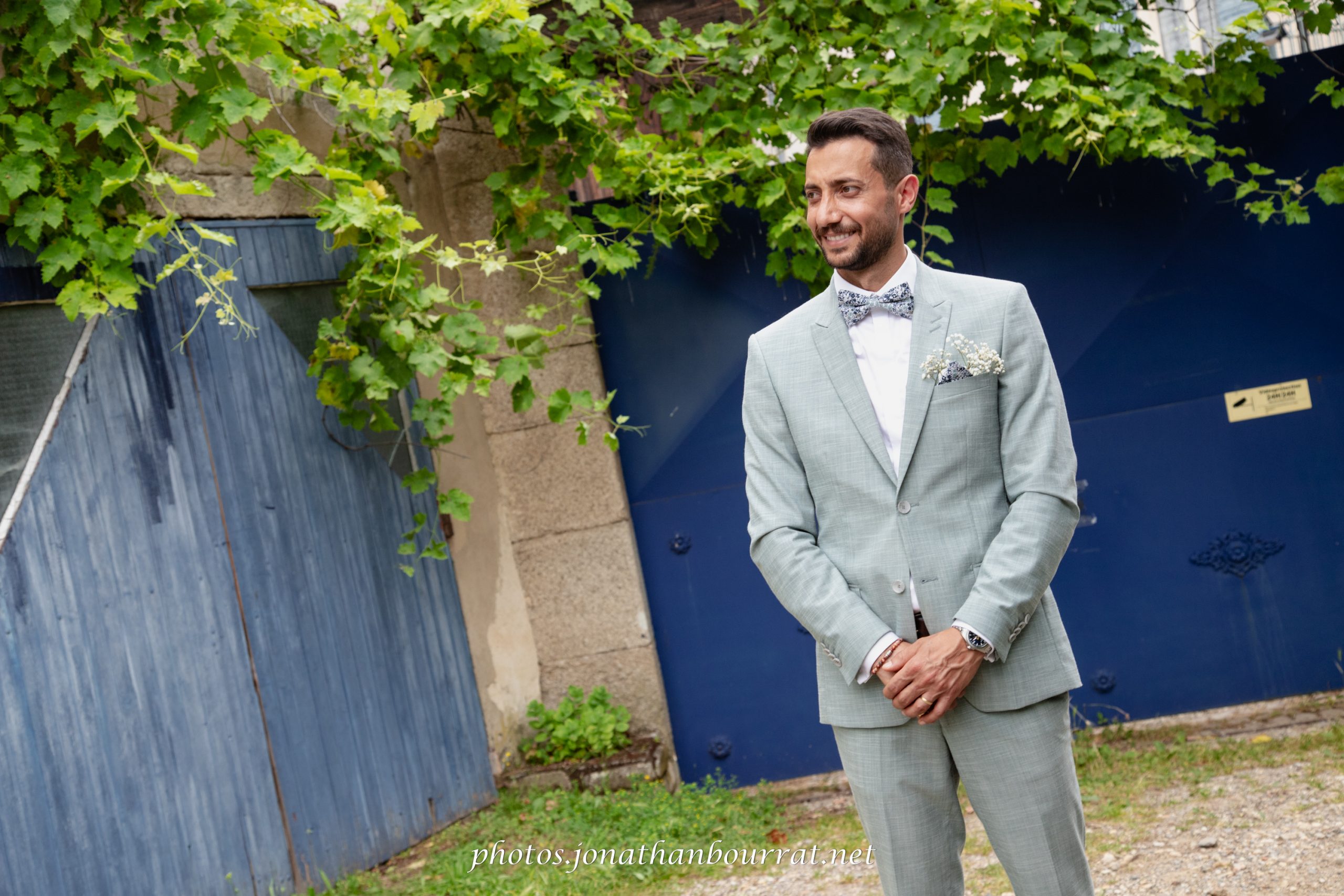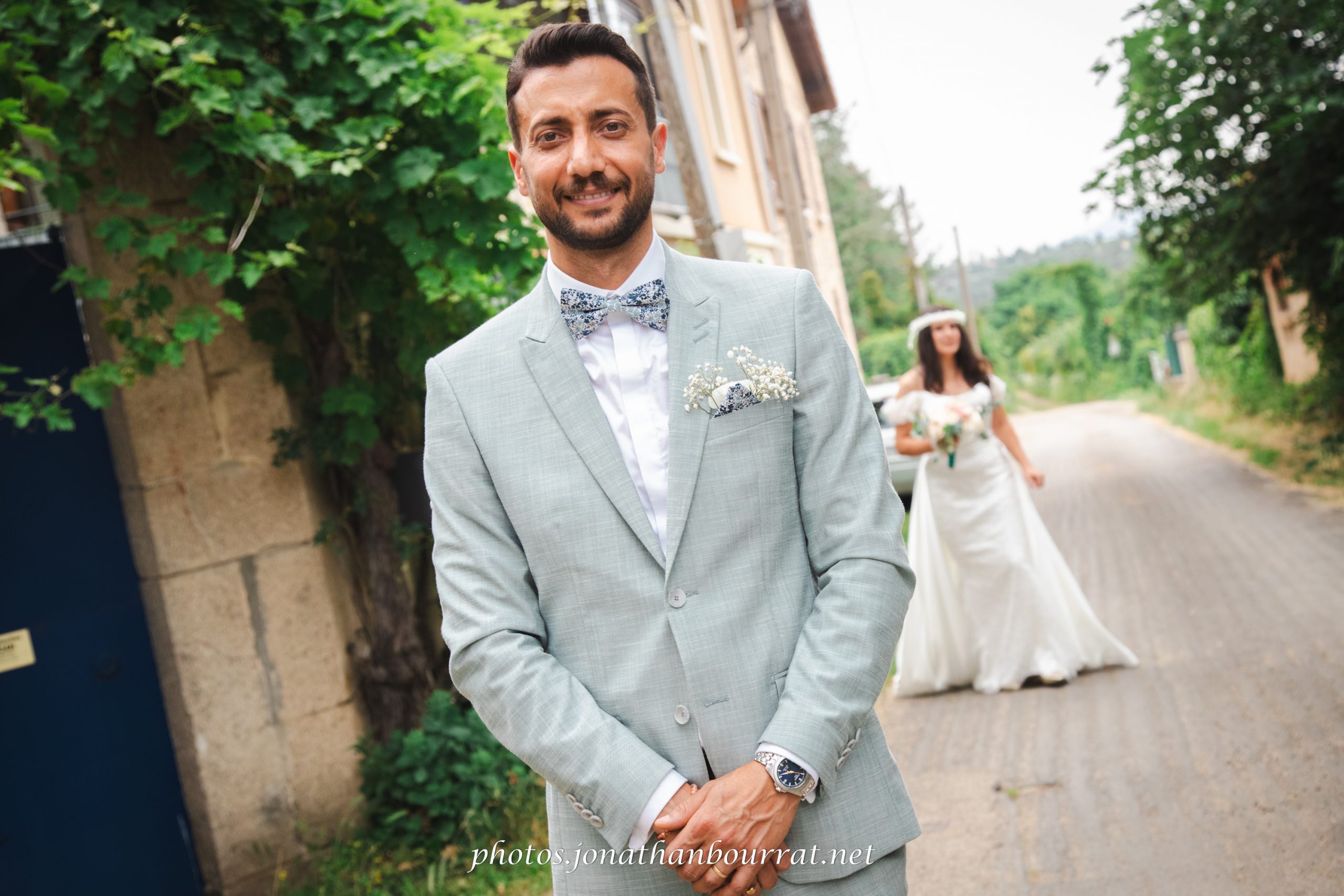 Comme vous pouvez le voir dans l’exemple présenté ici, le marié tourne le dos à la future madame qui s’approche derrière lui (à noter qu’il s’agit du chemin derrière la maison familiale). Pas à pas, la tension monte… jusqu’à ce qu’elle lui indique de se retourner. S’ensuit un joli moment de complicité qui se conclut par un baiser et quelques jolis clichés! 😉