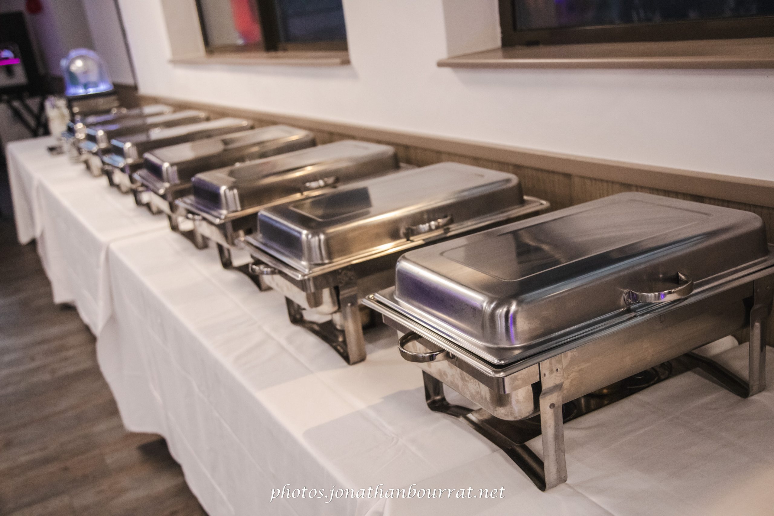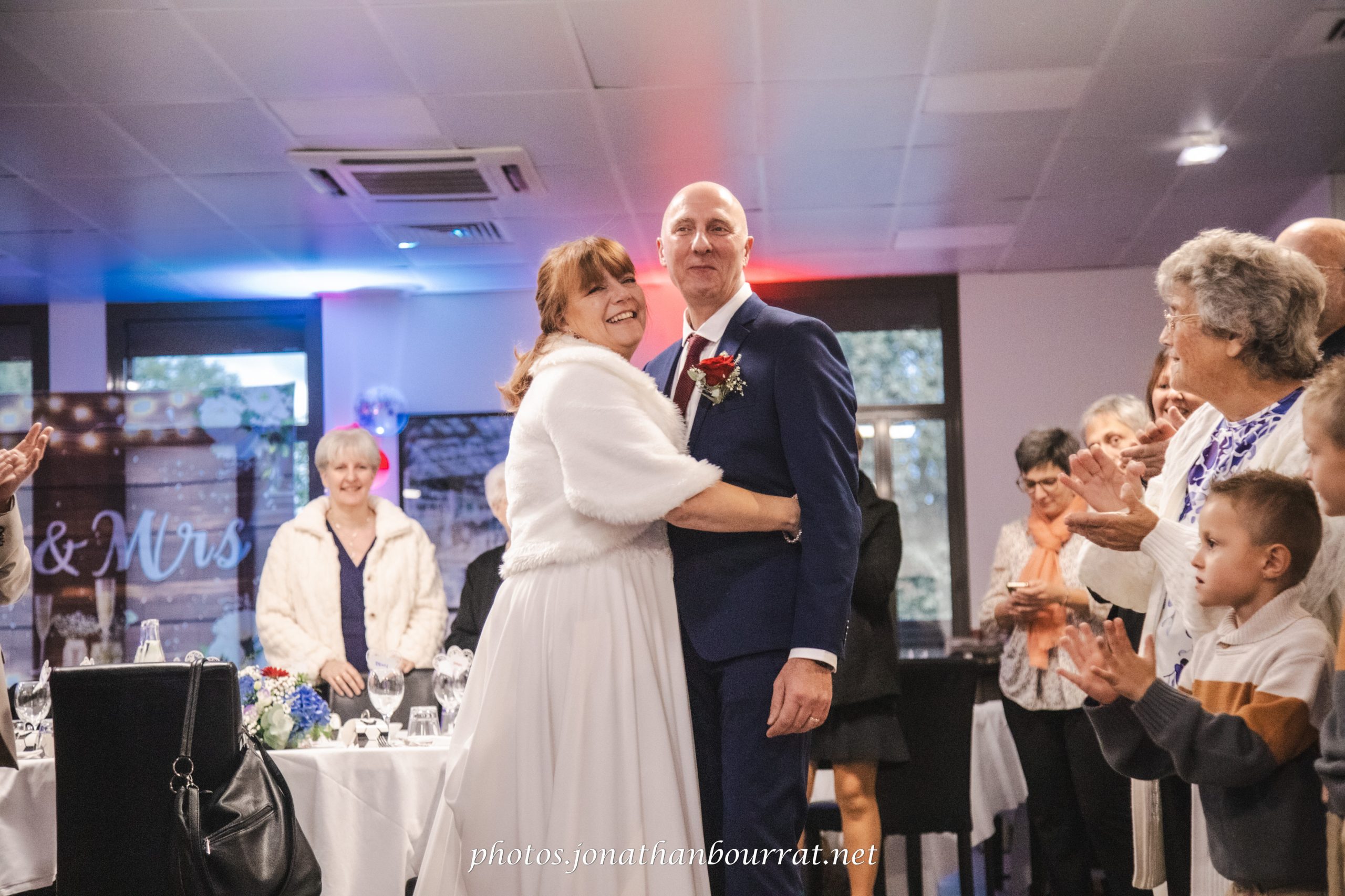 Il fut ensuite temps d’accéder à la salle de réception pour débuter la soirée avec petits-four, canapés et cocktail de bienvenue. Les mariés firent une entrée triomphale en étant longuement applaudi par les invités. Le DJ était aux platines pour assurer l’ambiance musicale.
